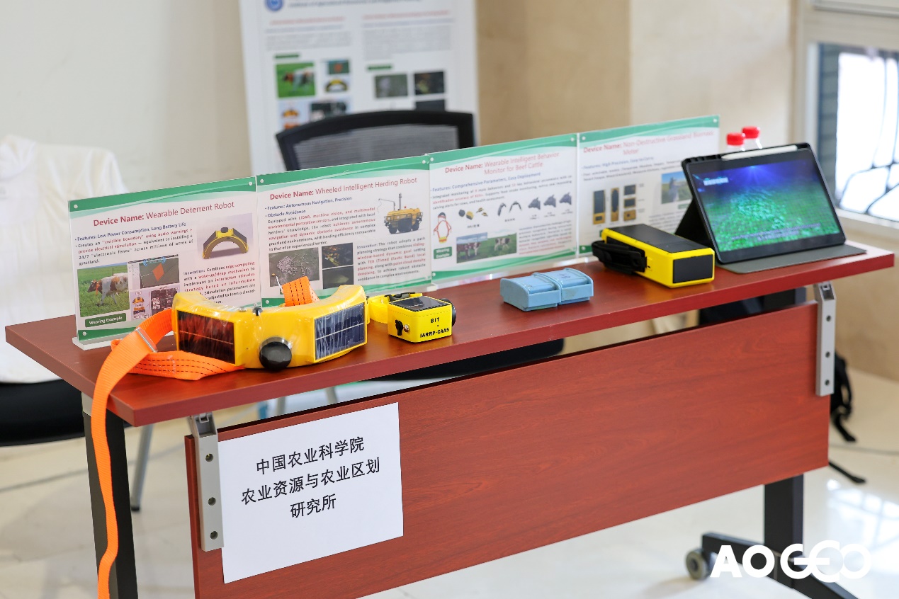 此外,团队助理研究员邹楚围绕“天然草原智能放牧与草畜精准管控关键技术”项目研发的硬件产品进行了现场讲解。相关设备紧贴牧场实际生产需求,涵盖具备牛羊智能驱赶与路径引导功能的穿戴式及轮式机器人、穿戴式肉牛行为智能检测仪、草原生物量无损伤测量仪等,为智慧牧场数字化管理与科学决策提供了有力工具。