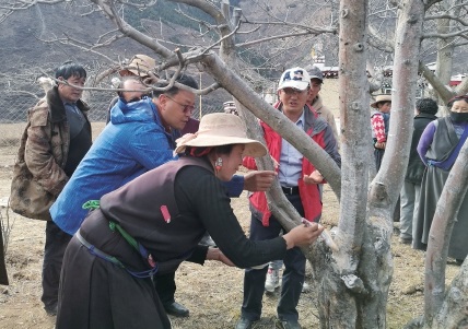 国家苹果产业技术体系川西高原综合试验站谢红江研究员(左二)在指导阿坝州苹果病虫害防治。 资料图